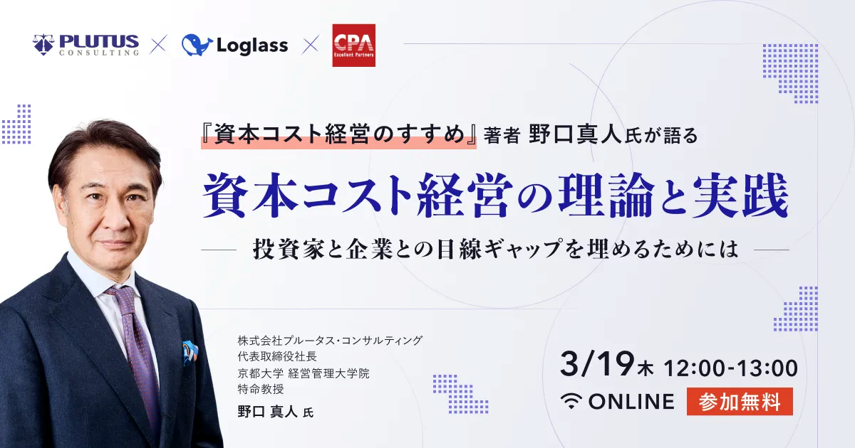 この度、2026年3月19日(木)に株式会社ログラス、CPAエクセレントパートナーズ株式会社との共催セミナー「『資本コスト経営のすすめ』著者 野口真人氏が語る資本コスト経営の理論と実践 ~投資家と企業との目線ギャップを埋める為には~」に、プルータス・コンサルティングより代表取締役社長の野口 真人が登壇いたします。